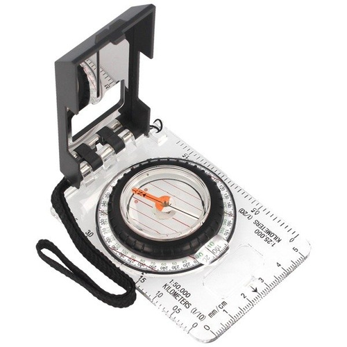 The tracking compass is equipped with a millimetre scale of 1: 25,000 K and 1:50,000 K for easy evaluation of the distance on the map. The rotating ring is covered with plastic to facilitate efficient operation in all weather conditions. Equipped with a mirror and a magnifying glass for easy reading.