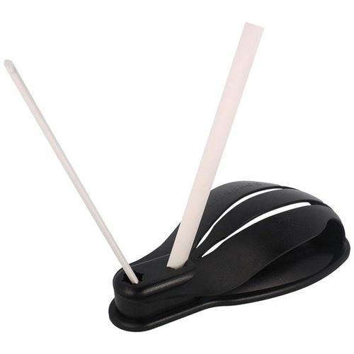 Multifunctional injection-moulded base made of impact-resistant ABS plastic. Specially designed holes hold the abrasive bars at an ideal angle of 40° (20 degrees per side) to ensure sharp, durable edges. Star-shaped holes in the base allow rods to be rotated to take advantage of clean, as yet unused abrasive surfaces or to set rod angles to sharpen serrated edges. An integrated guard protects the hand from injury during sharpening.